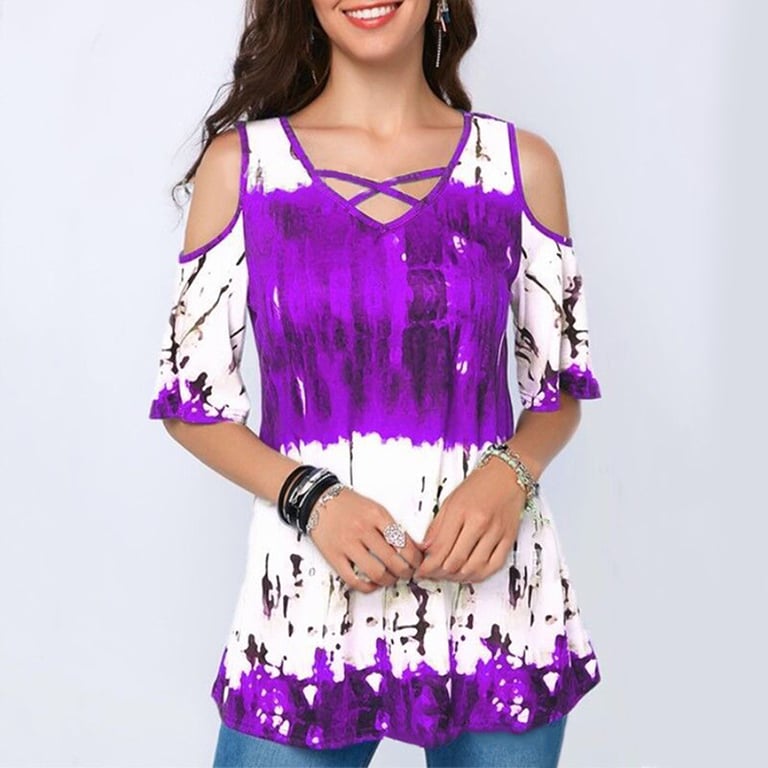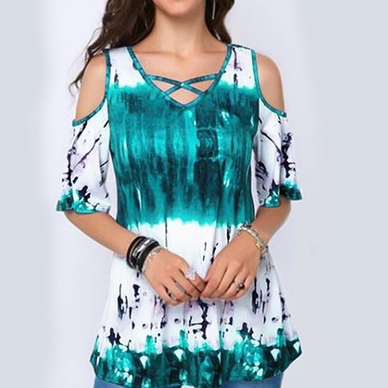 Modische Batikbluse mit kurzen Ärmeln und V-Ausschnitt. Erhältlich in 4 Farbvarianten.