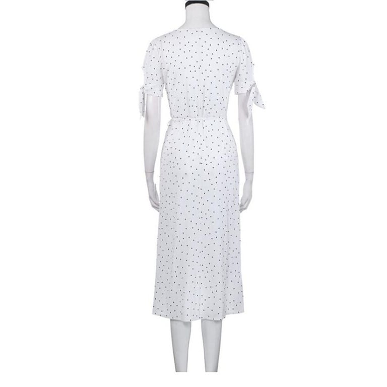 Damenlange Kleider mit tiefem V-Ausschnitt und kurzen Ärmeln mit Schleife. Das Kleid ist wickelbar und hat eine Schleifenbindung, der Rock hat einen hohen Schlitz an der Seite. Weiß mit gepunktetem Muster.