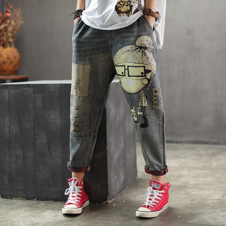 Damen Boyfriend-Jeans mit elastischem Gummibund und seitlichen Taschen. Originelles Patch auf der Vorderseite. Weite Beinform.