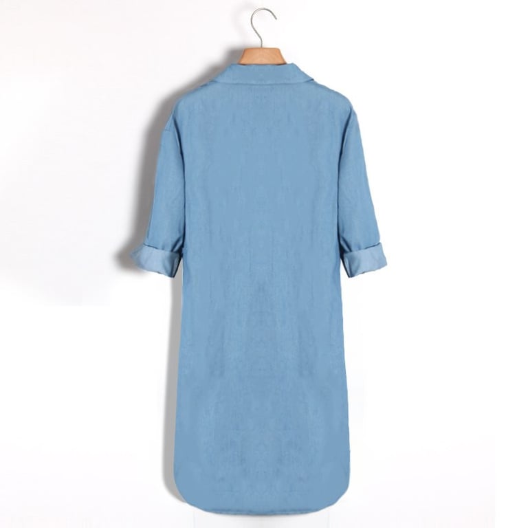Damenjeanskleider mit Dreiviertelärmeln und V-Ausschnitt mit Kragen. Das Kleid hat einen lockeren, geraden Schnitt und zwei seitliche Taschen. Erhältlich in zwei Varianten.