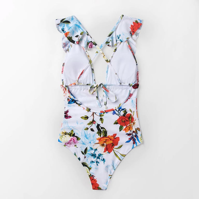 Damen Einteiler mit schmalen, über Kreuz verlaufenden Trägern auf dem Rücken. Tiefer V-Ausschnitt mit Rüsche verziert. In mehreren Farbvarianten erhältlich.