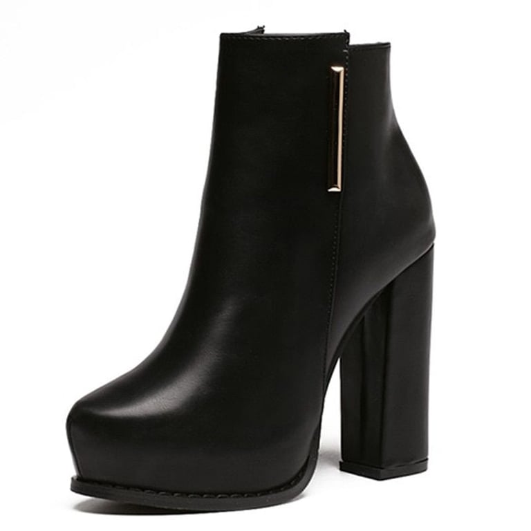 Damen schwarze Stiefeletten mit hohen Absätzen und goldener Verzierung.