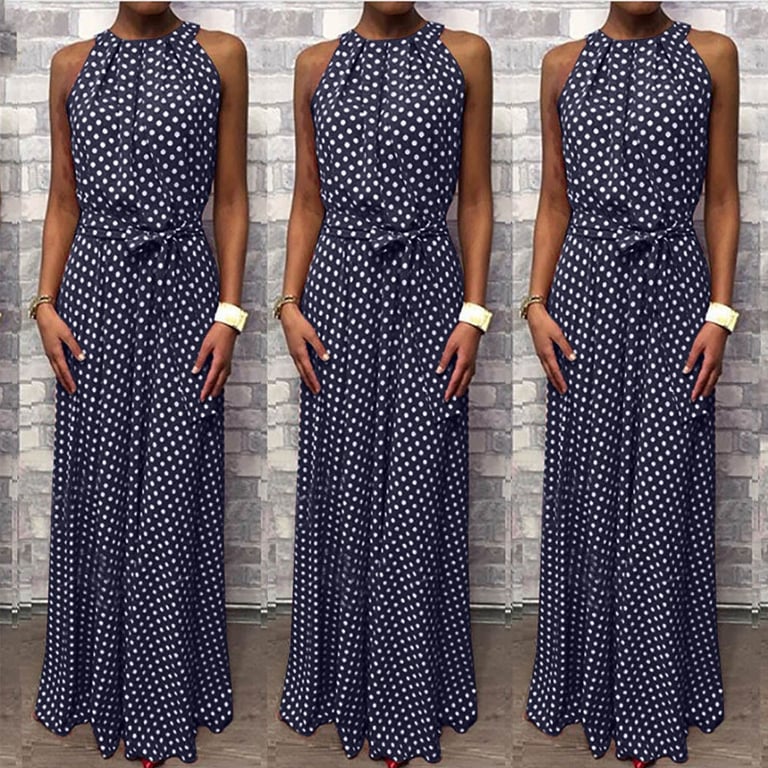 Elegante Damenkleider mit attraktiven Punkten und bunten Farben. Der lange Schnitt wird im Sommer bei Spaziergängen schön aussehen.