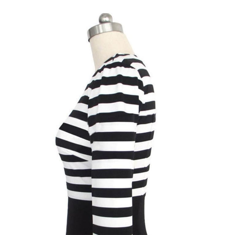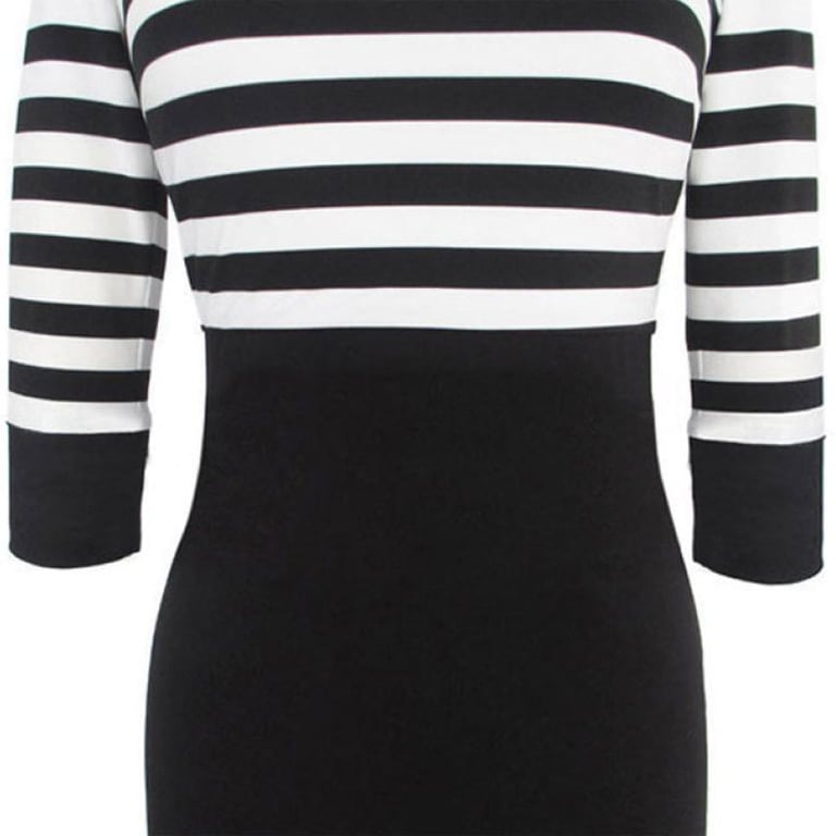 Elegante Damen-Kleid im Etuistil mit gestreiftem Muster in Schwarz und Weiß. Das Kleid hat eine knielange Länge, Dreiviertelärmel und einen runden Ausschnitt.