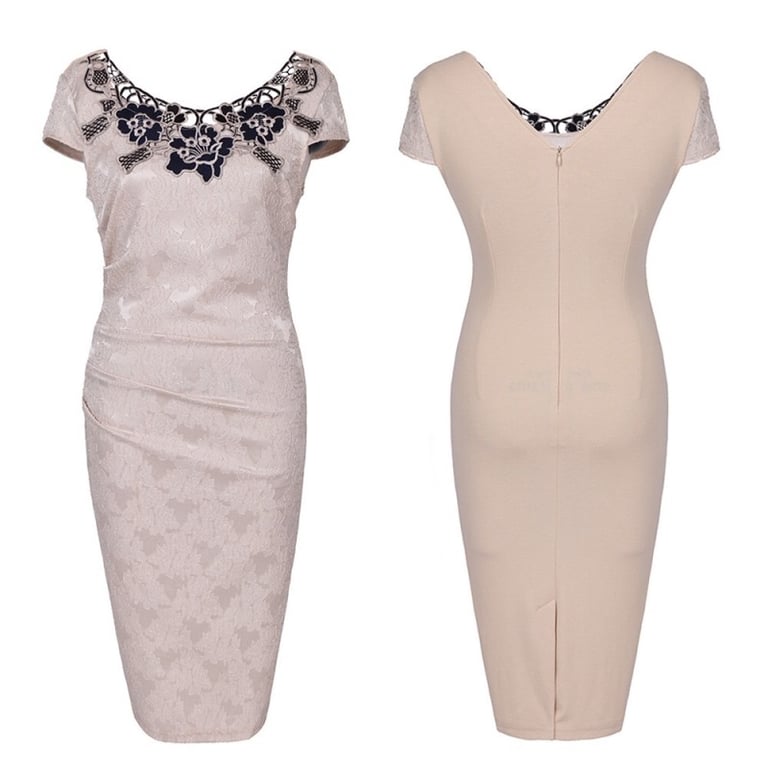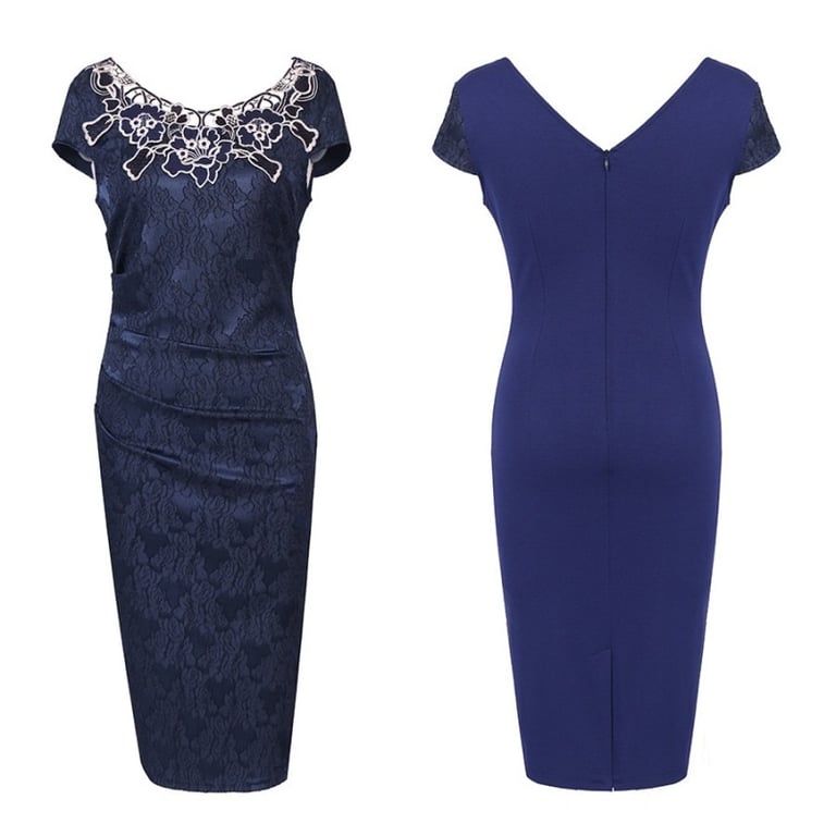 Damen elegante Kleider mit Blumen-Spitze. Rundhalsausschnitt. V-Ausschnitt hinten und Reißverschluss.