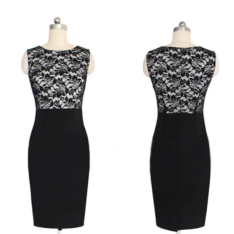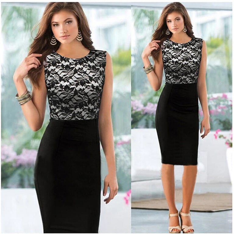 Damen Etuikleid ohne Ärmel. Blumen-Spitze. Rundhalsausschnitt.