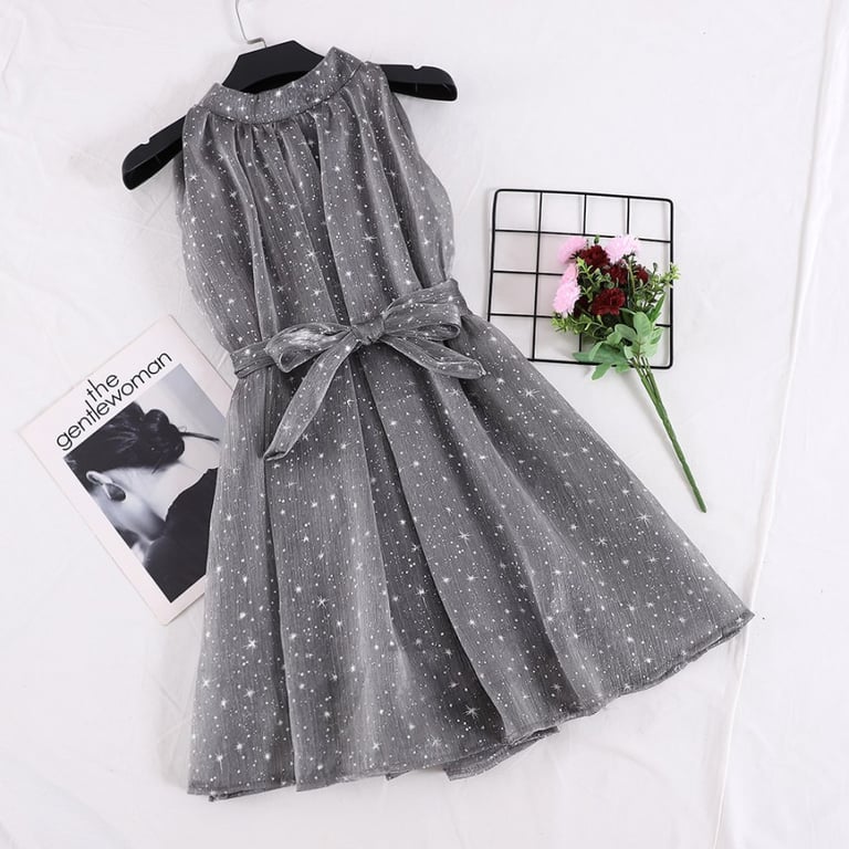 Damenkurzes Kleid mit glitzernder Oberfläche. Das Kleid ist ärmellos mit Trägern und hat einen lockeren, gerafften Rock sowie ein Band zum Binden in der Taille. Erhältlich in mehreren Farben.