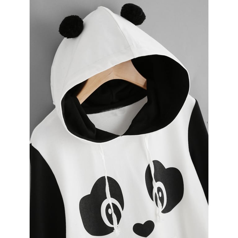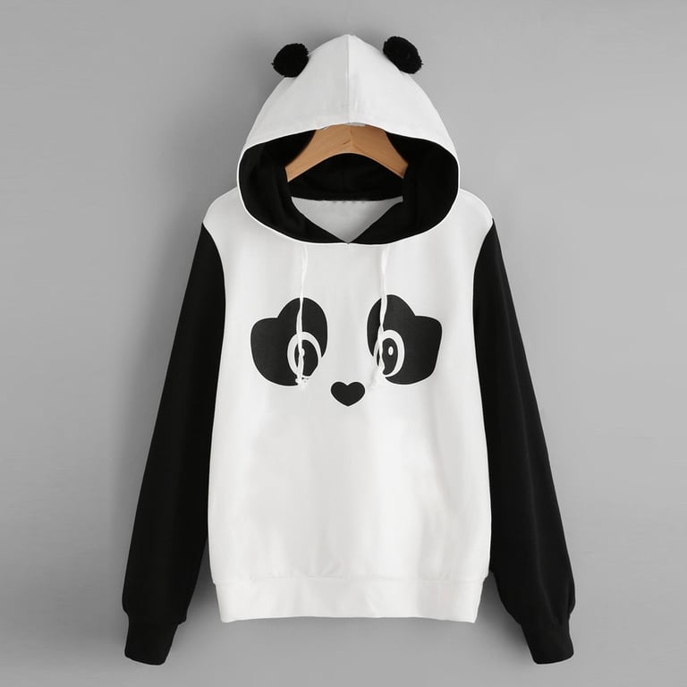 Stylischer Pullover mit Panda-Motiv. Schwarz-weißer Pullover, der an der Kapuze mit kleinen schwarzen Ohren verziert ist.