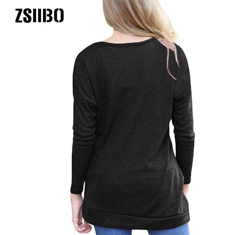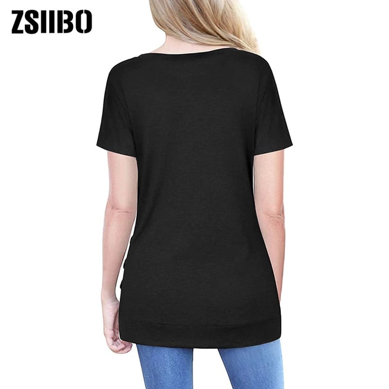 Damen langes, lockeres Shirt in Schwarz. Dekoration mit Knöpfen. Zwei Ausführungen: Kurzarm und Langarm.