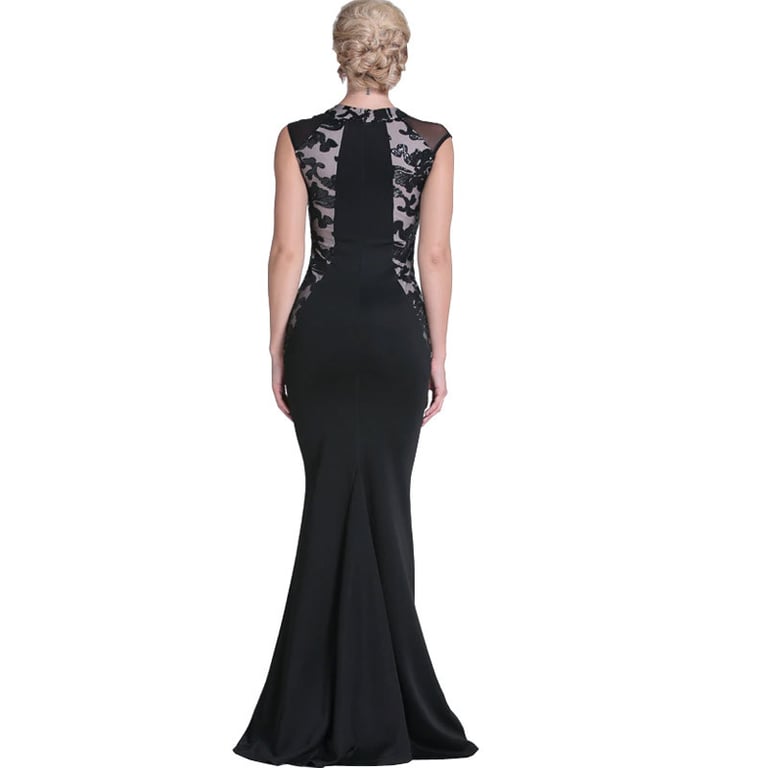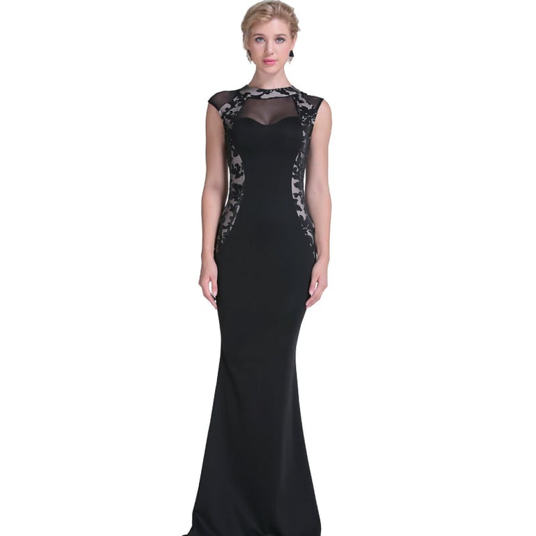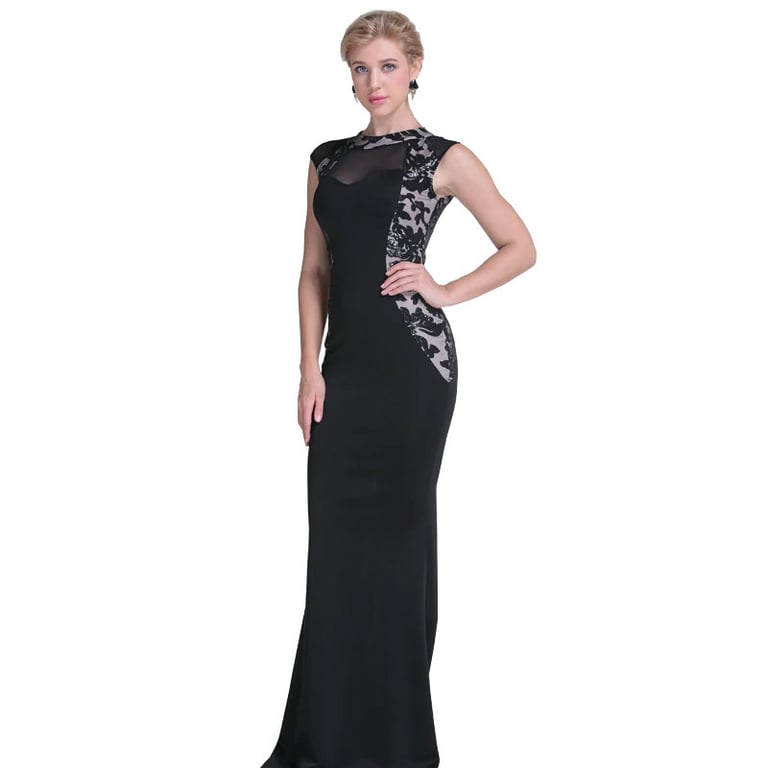 Damen lange Abendkleider geeignet für den Ball. Das Kleid hat kurze Ärmel und ist leicht tailliert mit einem Rock, der bis zum Boden reicht. Der Ausschnitt und die Seiten sind mit einem Blumenmuster verziert.