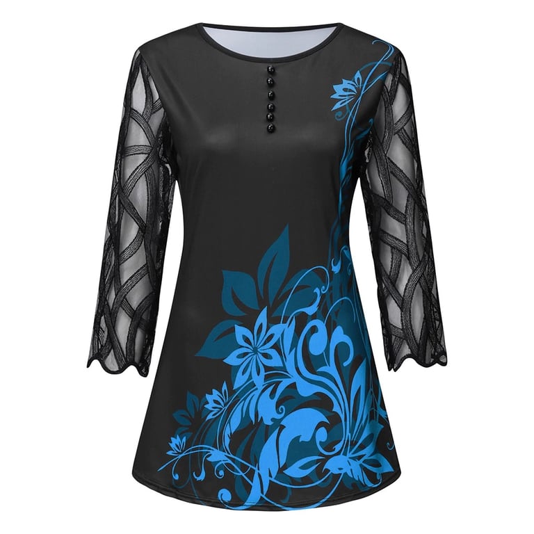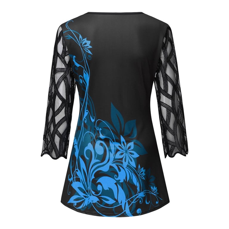 Damen schwarze Bluse mit 3/4 transparenten Ärmeln, mit blauem Blumenmuster und rundem Ausschnitt.