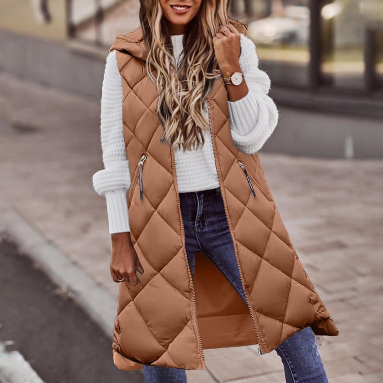 Die gesteppte modische Weste mit Kapuze ist für jedes trübe Wetter geeignet.