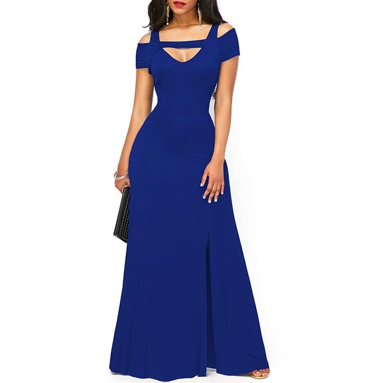 Damen lange Kleider mit kurzen Ärmeln, tiefem V-Ausschnitt, Schlitz an der Seite.
