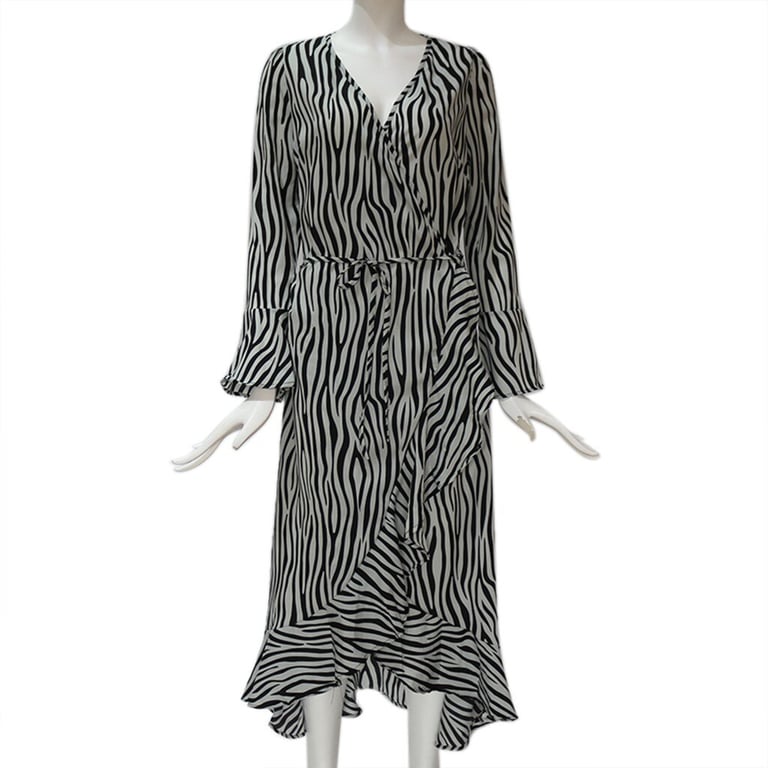 Damen romantische lange Kleider mit gewelltem Rock und Zebramuster. Die Kleider sind ideal für den Sommer, haben lange Ärmel und einen V-Ausschnitt.