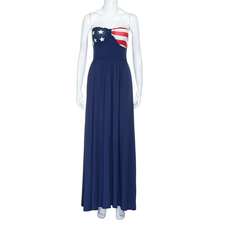 Damen lange Strandkleider ohne Träger. Das Kleid hat einen langen blauen Rock. Der Ausschnitt ist rund und mit der Flagge der USA verziert.