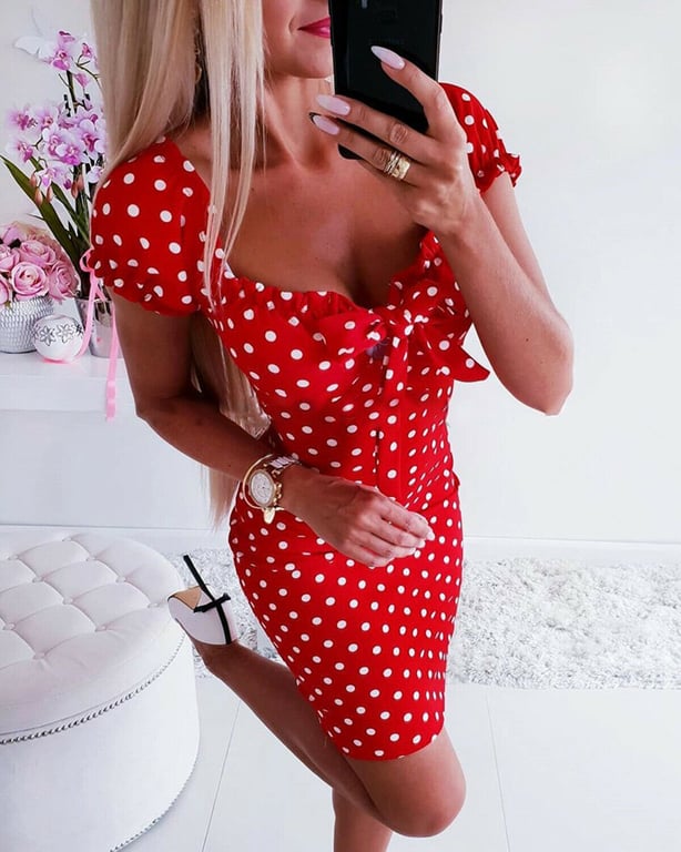 Damen Mini Kleid mit kurzen Ärmeln und Schleife im Ausschnitt.
