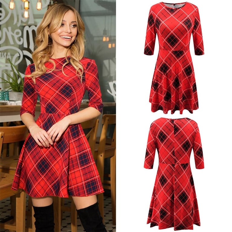Damenmodische kariert Kleid im A-Linien-Schnitt mit 1/2 Ärmeln