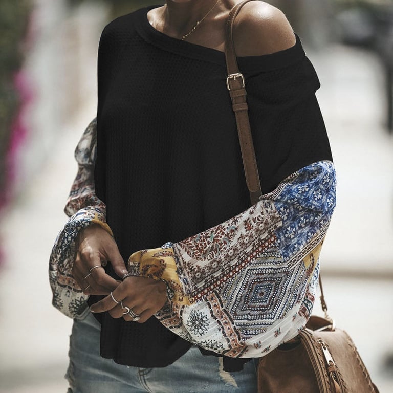 Damen Stricktop, T-Shirt mit Rundhalsausschnitt. Langer, weit geschnittener Ärmel mit buntem Druck. Lockerer, bequemer Schnitt. Erhältlich in mehreren Farbvarianten.