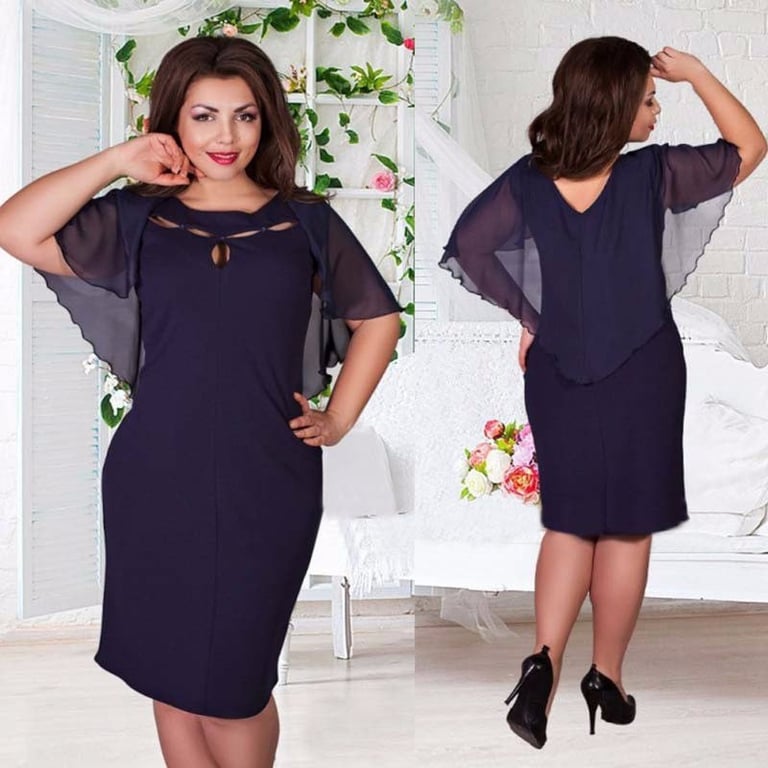 Damenkleid mit rundem Ausschnitt auf der Vorderseite und V-Ausschnitt auf der Rückseite. Das Kleid hat eine taillierte Passform und Fledermausärmel. Erhältlich in großen Größen. Verschiedene Farben.