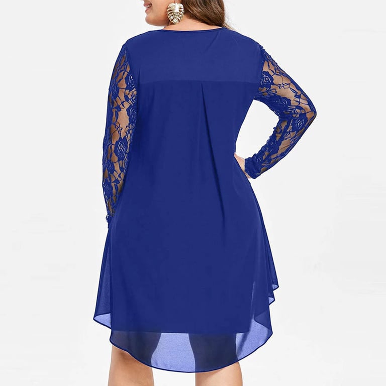 Damenkleid mit langen Ärmeln, verziert mit Spitze. Das Kleid hat einen lockeren Schnitt und einen runden Ausschnitt. Plus-Size-Größen. Erhältlich in mehreren Farbvarianten.