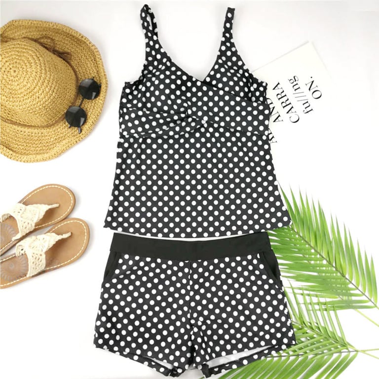 Damen Zweiteiler Badeanzug im Tankini-Stil mit Push-Up-Effekt. Der Badeanzug hat einen V-Ausschnitt und schmale Träger. Der Unterteil mit Shorts und elastischem Bund. Bedruckt mit gepunktetem Muster. Erhältlich in drei Farbvarianten.