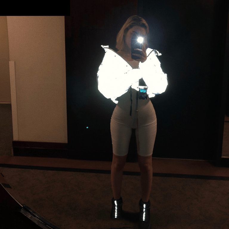 Kurze Herbst- und Winterjacke, die nachts im Licht leuchtet. Ideal für nächtliche alkoholische Ausflüge, damit Sie nicht übersehen werden.