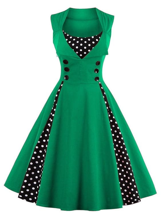 Damen klassische Retro Kleider, die heute wieder in Mode sind. Elegante Kleider, die mit einem gepunkteten Muster und Knöpfen versehen sind.