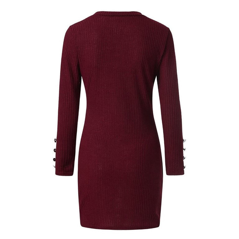 Damenkurzes Kleid mit langen Ärmeln. Enganliegender Schnitt mit Knopfdetails am unteren Teil und an den Ärmeln. Erhältlich in mehreren Farbvarianten.