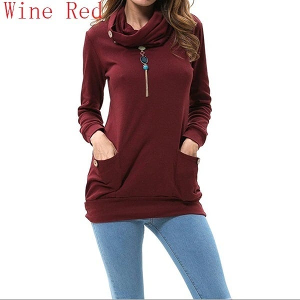 Damenmode, langer Pullover. Dekoration – Knöpfe. Erhältlich in 5 Farben.