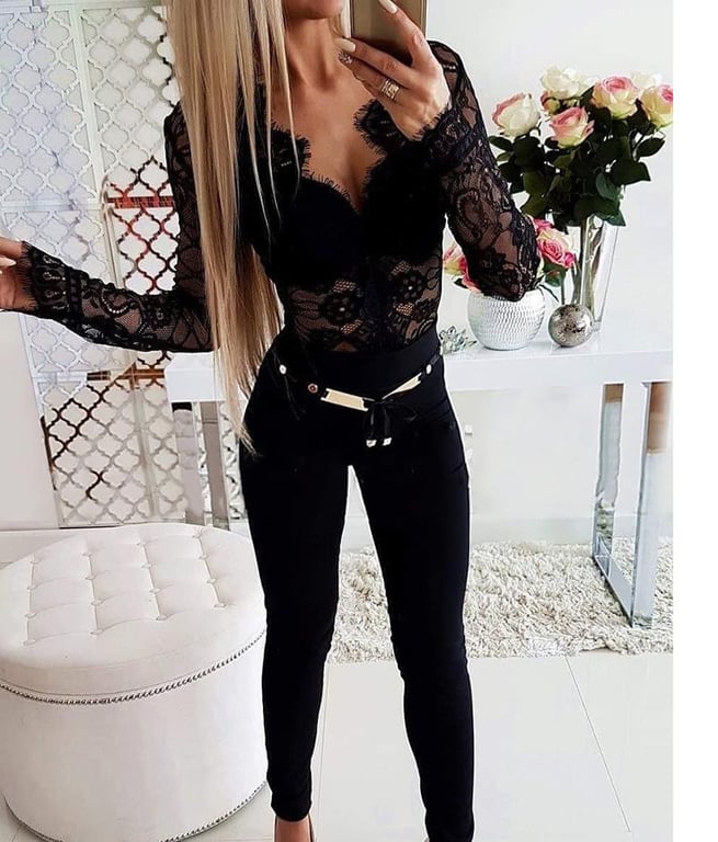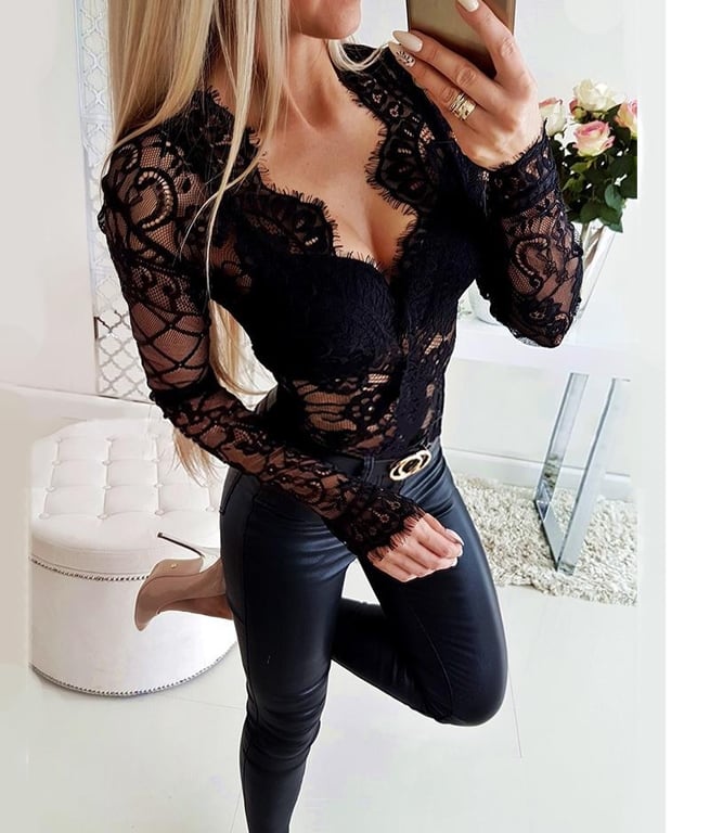 Damen schwarzes Spitzenoberteil mit langen Ärmeln