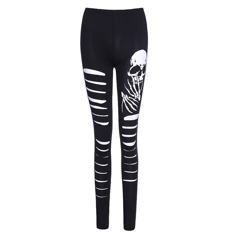 Einzigartige Leggings mit dekorativen Rissen und Totenkopf-Print. Auf den Hüften befinden sich die Hände eines Totenkopfs. Verpassen Sie nicht dieses limitierte Angebot auf Lager.