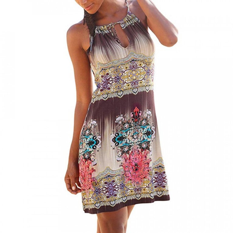 Damen Sommerkleid mit buntem Muster. Lockere Passform mit knielanger Länge. Spaghettiträger.