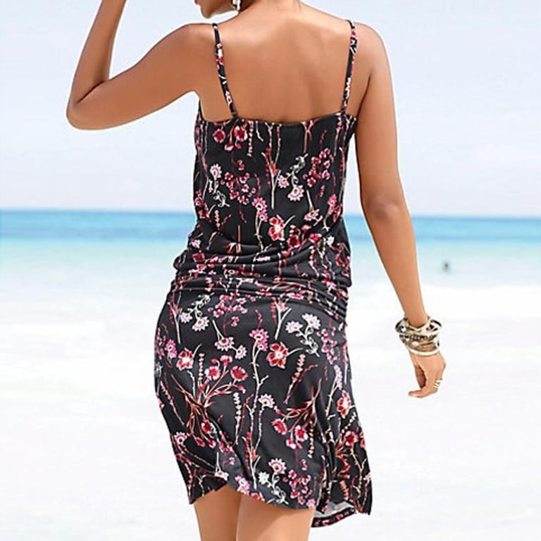Damen Sommerkleid mit Spaghettiträgern. Enganliegender Schnitt mit knielanger Länge. Bunter Druck mit Blumenmotiv.
