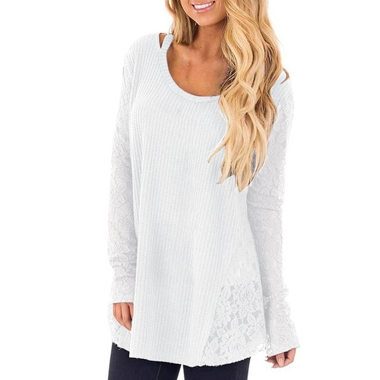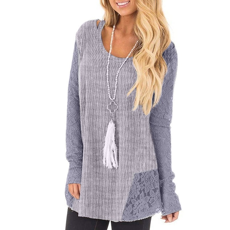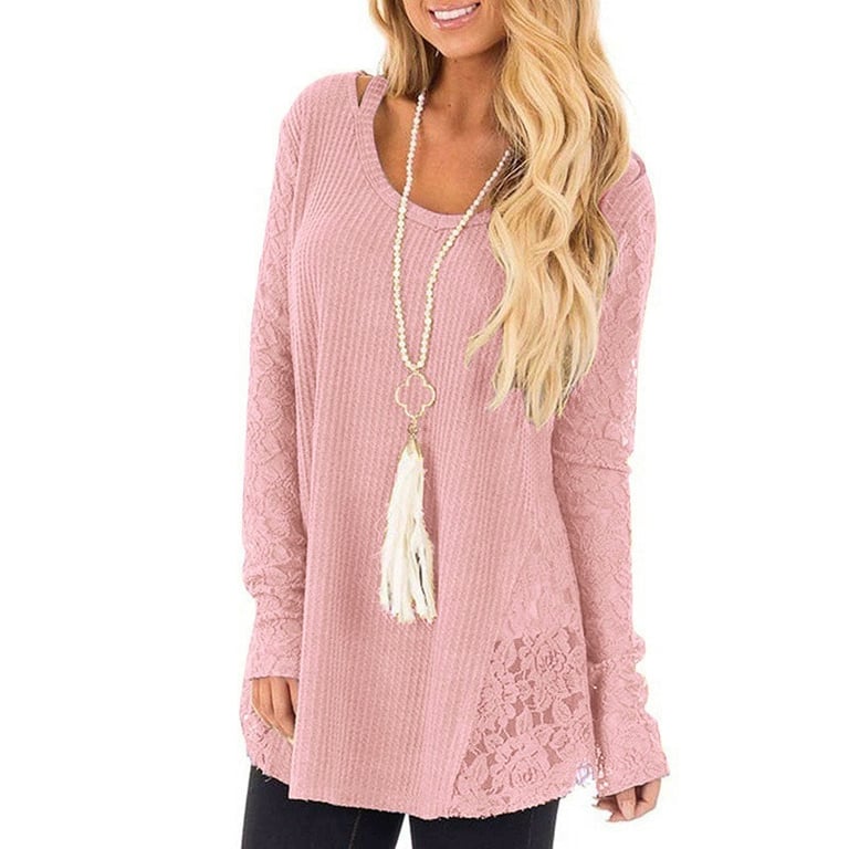 Damen Baumwollpullover mit langen Ärmeln, rundem Ausschnitt und Spitzenverzierung.
