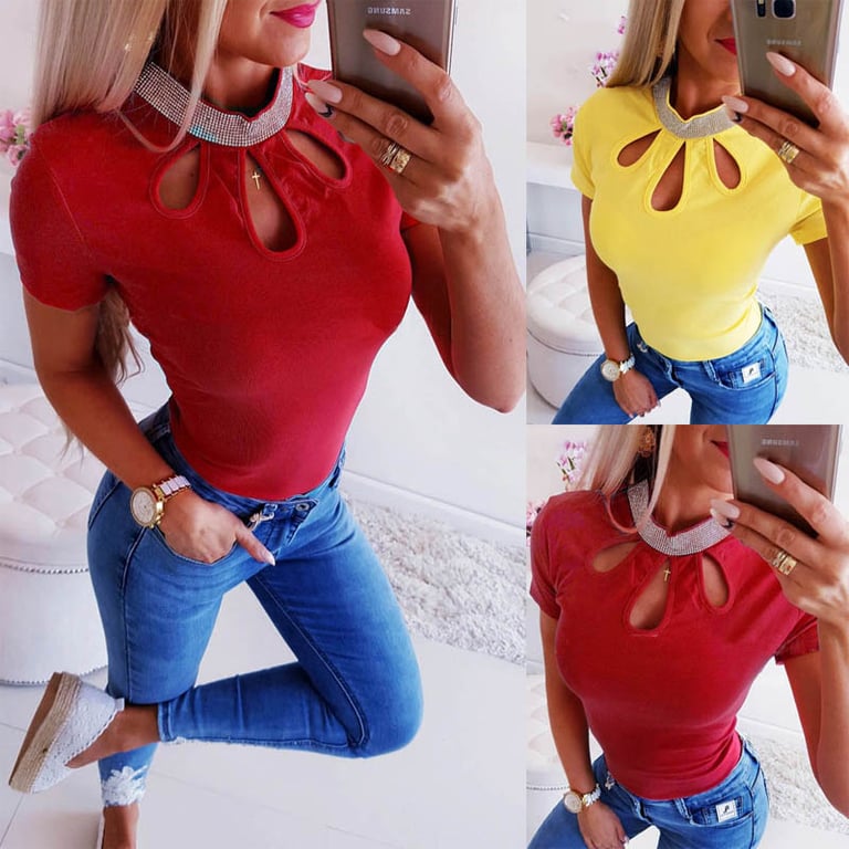 Damen T-Shirt mit Ausschnitten und Strasssteinen