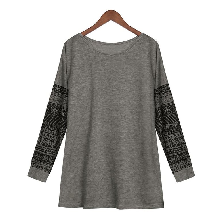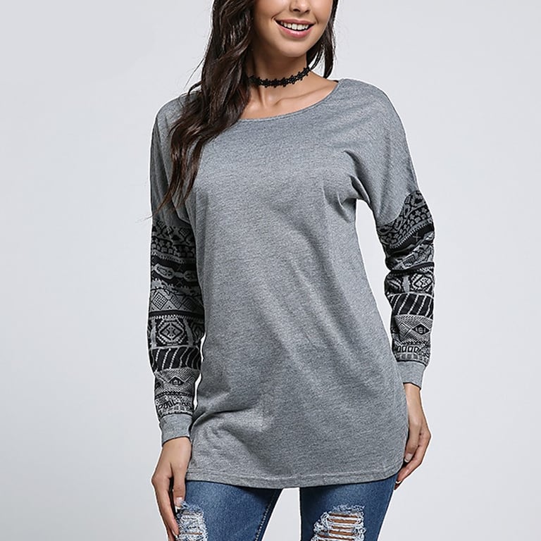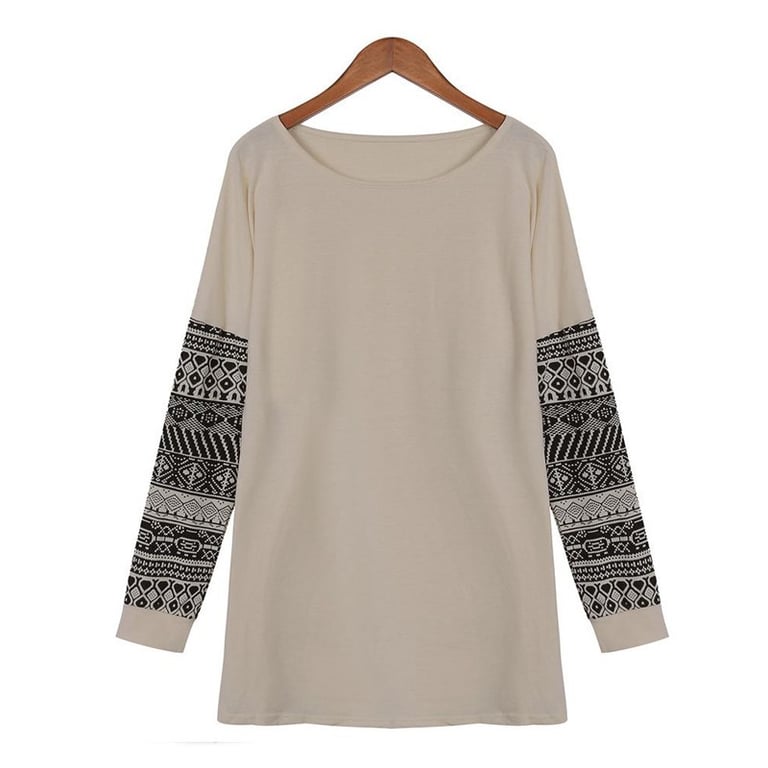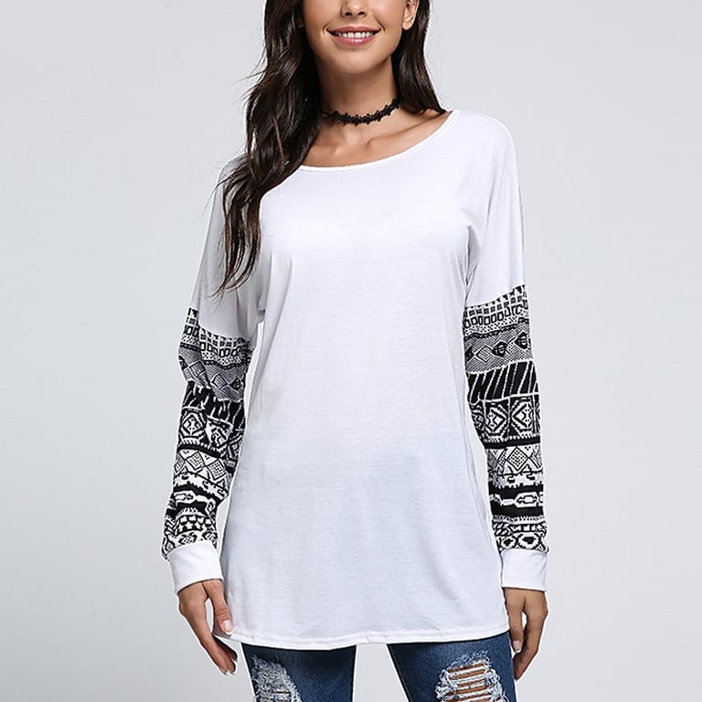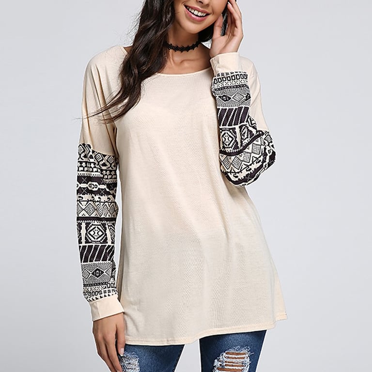 Damen T-Shirt in hellen Farben. Es hat lange Ärmel mit Ethno-Mustern. Angenehm zu tragen dank Baumwolle.