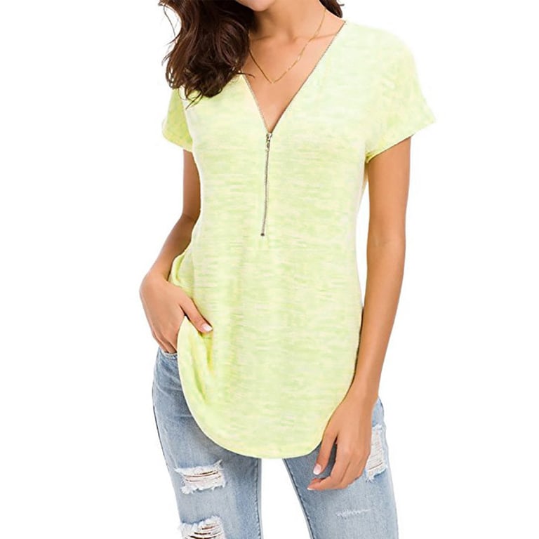 Damen T-Shirt mit meliertem Design in lockerer Passform. Das Shirt hat kurze Ärmel und einen V-Ausschnitt mit dekorativem Reißverschluss. Angenehmes, luftiges Material. Erhältlich in mehreren Farbvarianten.