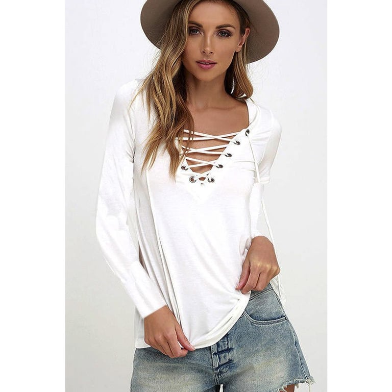 Damen T-Shirt mit langen Ärmeln und V-Ausschnitt mit Schnürung. Lockere gerade Passform. Erhältlich in mehreren Farbvarianten.