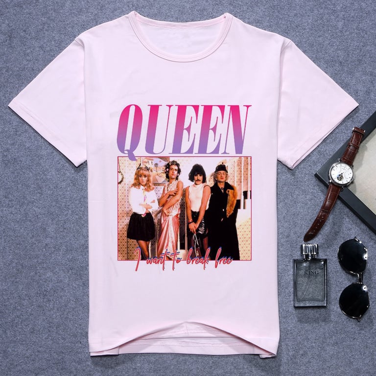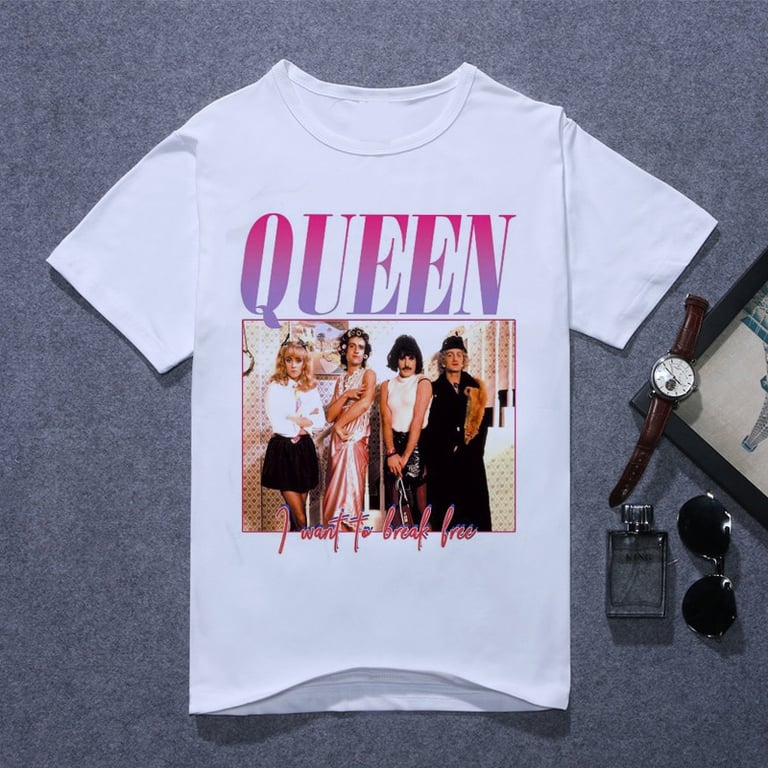T-Shirt für Frauen mit dem Motiv der bekannten Rockband QUEEN. In ihrer ursprünglichen Besetzung waren Freddie Mercury, Brian May, John Deacon und Roger Taylor.