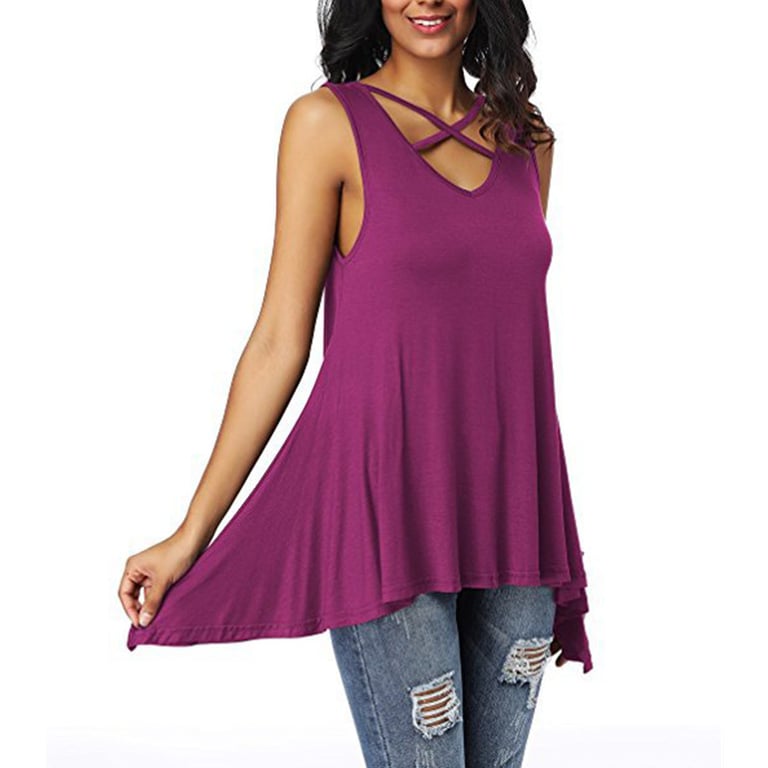 Damen Tanktop ohne Ärmel. Das Top hat einen V-Ausschnitt mit dekorativer Schnürung und einen lockeren asymmetrischen Schnitt. Erhältlich in mehreren Farbvarianten.