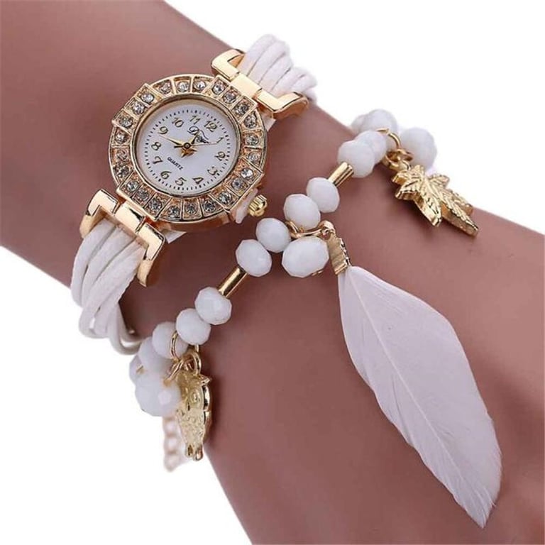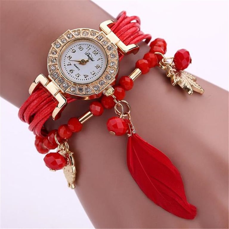 Stylische Uhren mit Schmuckelementen und elegantem Federdesign. Das Zifferblatt ist mit dekorativen Steinen besetzt.