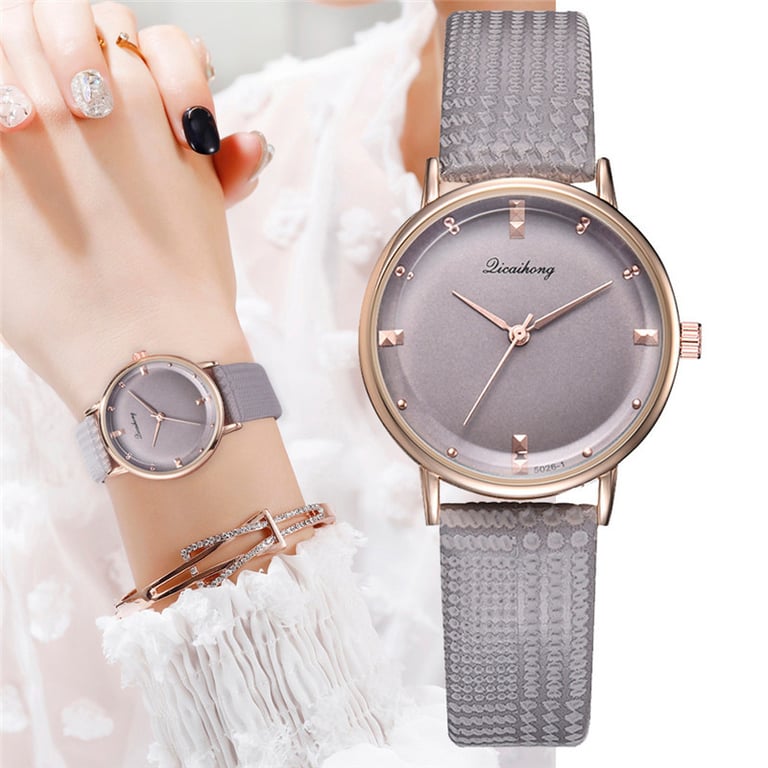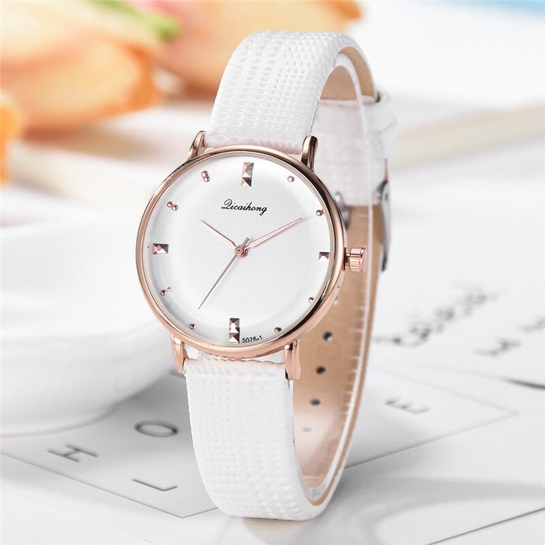Damenarmbanduhren mit einem originellen Kunstlederarmband. Zifferblatt in Goldfarbe mit kleinen Steinen. In mehreren Farbvarianten erhältlich.