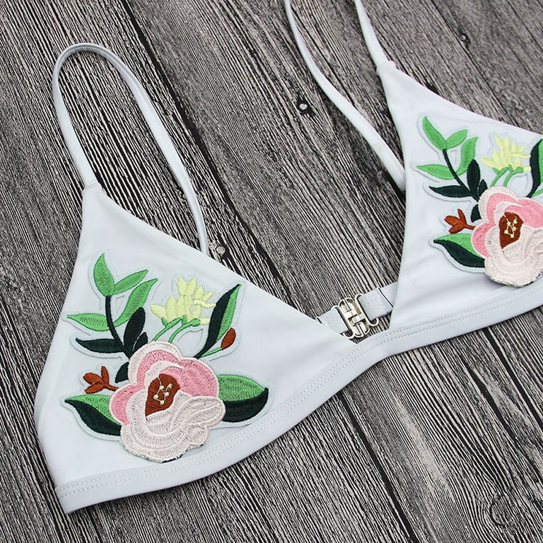 Damenbikini in Weiß mit modernem Aufnäher. Mehrere Größen zur Auswahl und kostenloser Versand!