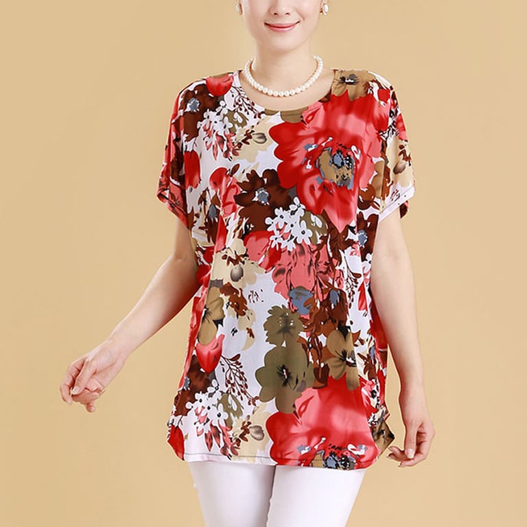Damenbluse mit kurzen Ärmeln und rundem Ausschnitt. Lockere Passform. Druck mit buntem Blumenmuster.
