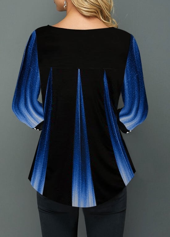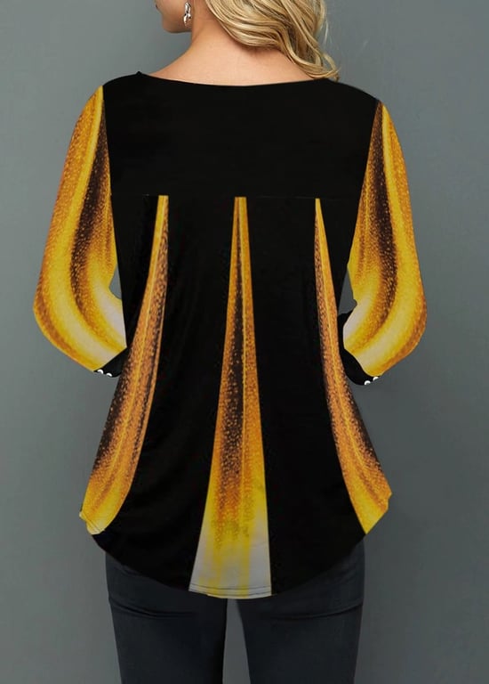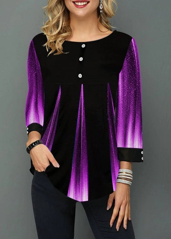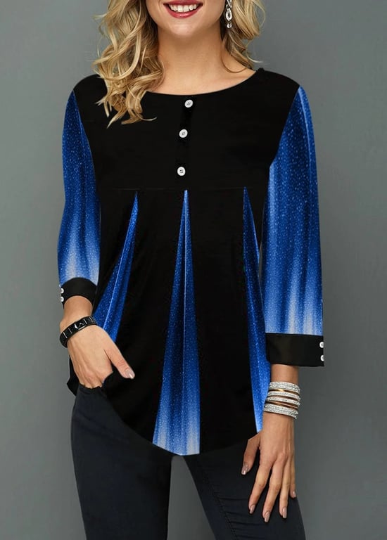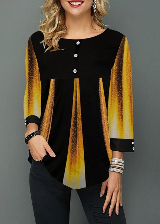 Lockere Damenbluse, 7/8-Ärmel, runder Ausschnitt mit Knöpfen.