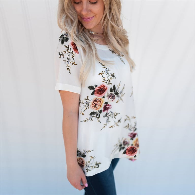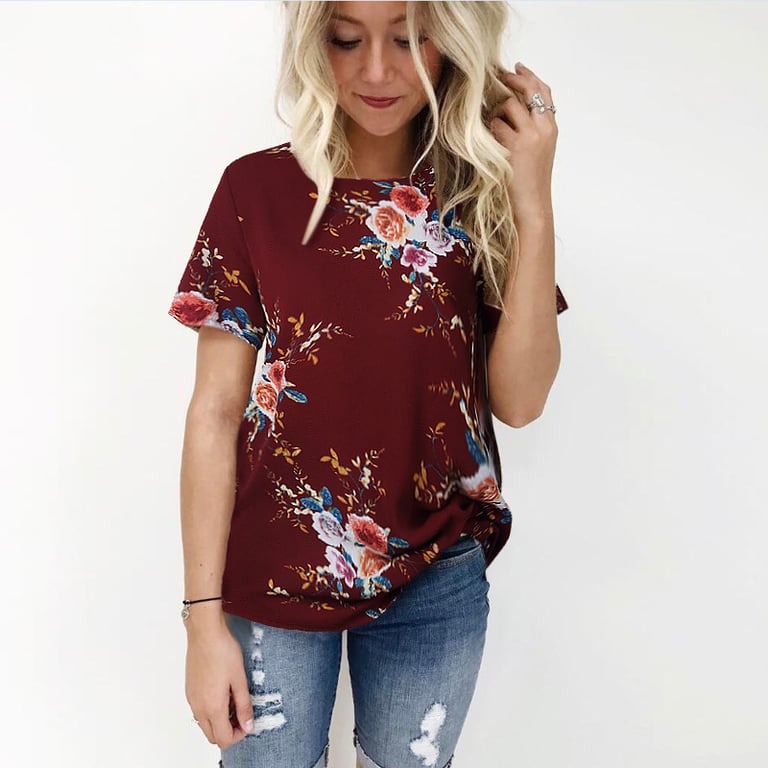 Damenbluse mit kurzen Ärmeln, rundem Ausschnitt und Blumenmuster.