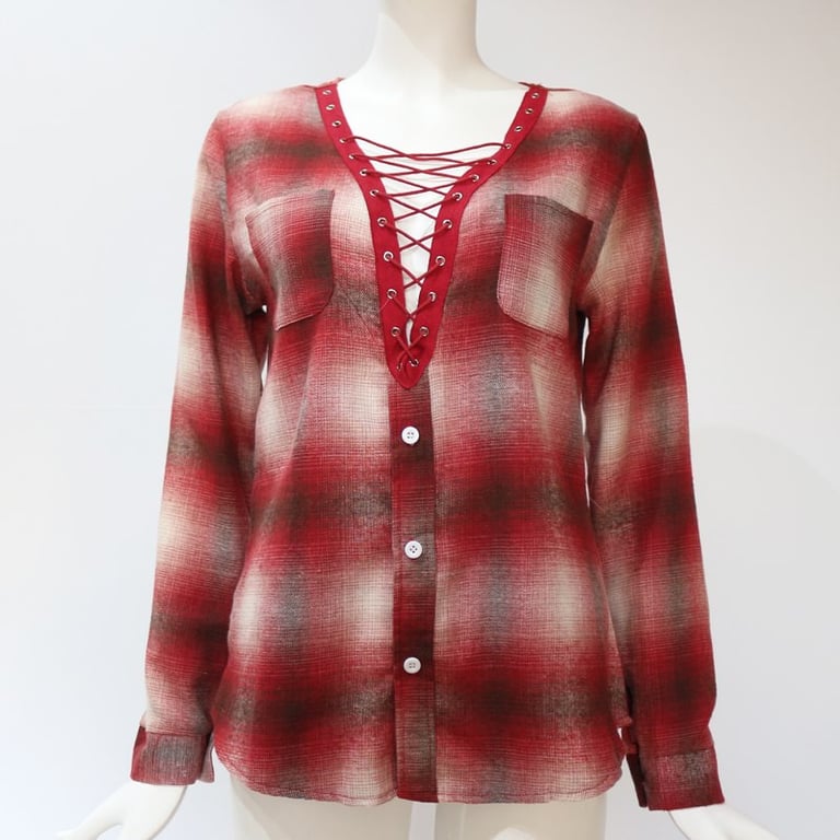 Damenbluse mit kariertem Muster. Die Bluse hat lange Ärmel und einen V-Ausschnitt mit Schnürung. Erhältlich in mehreren Farbvarianten.