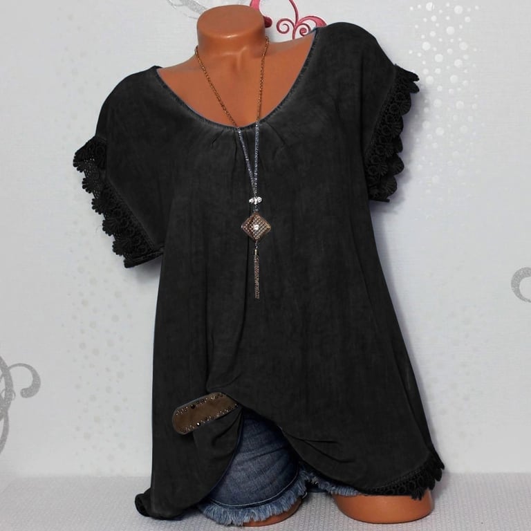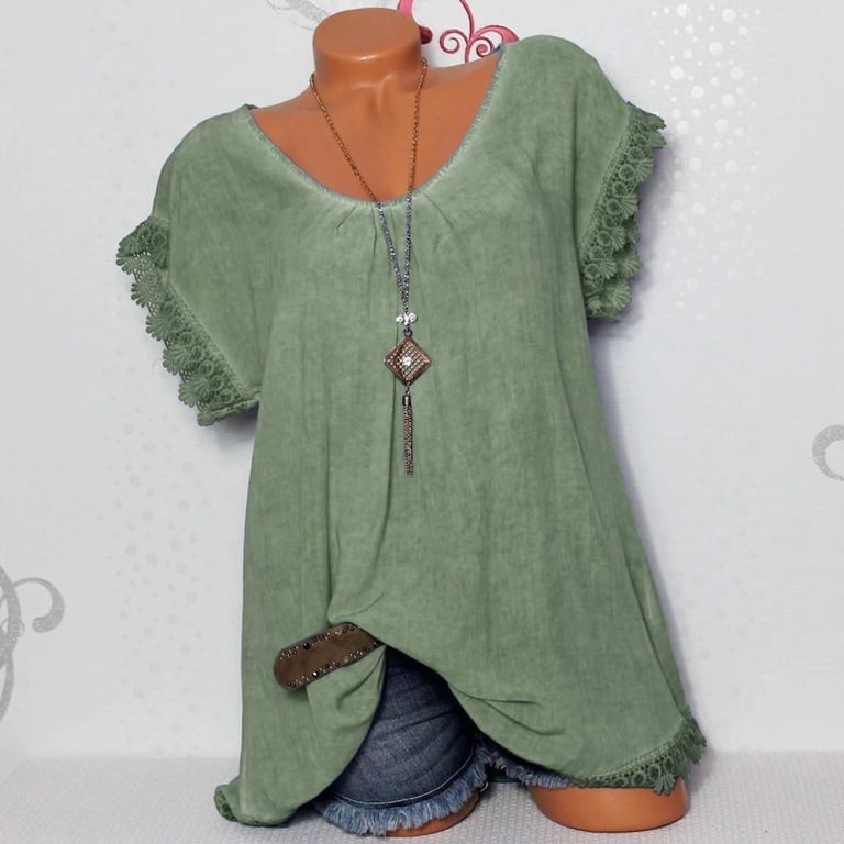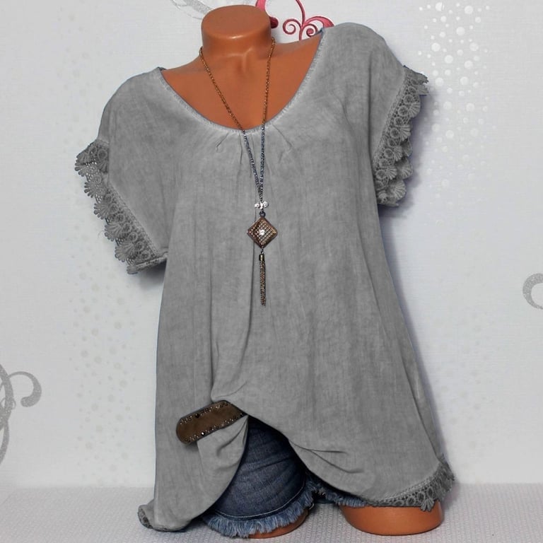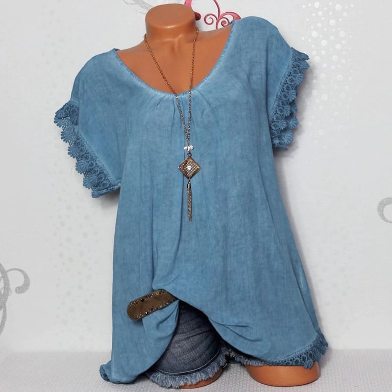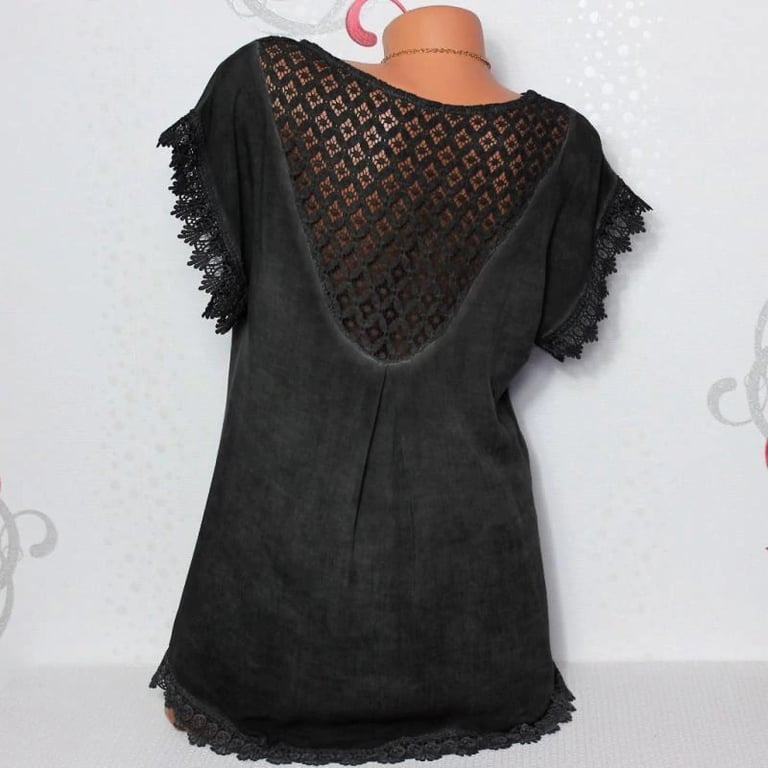 Legere Damenbluse mit Spitzenrand an den Ärmeln. Rundhalsausschnitt, Spitzenrücken.