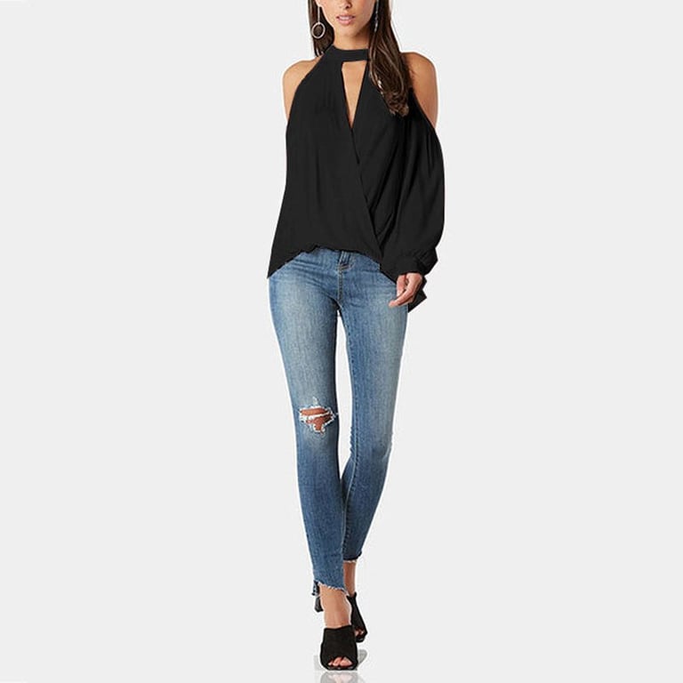 Damenbluse in elegantem Design mit überlappendem V-Ausschnitt. Langer, weit geschnittener Ärmel mit freiliegenden Schultern. Erhältlich in mehreren Farben.