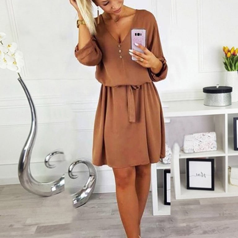 Damenhemdkleid mit V-Ausschnitt und Knöpfen. Das Kleid hat einen lockeren Schnitt mit einem Bindegürtel in der Taille. Erhältlich in mehreren Farbvarianten.